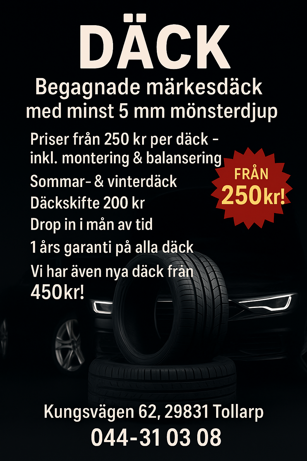 Tollarps Bil & Service AB är din lokala verkstadspartner i Kristianstad. Vi har byggt vår verksamhet på enkelhet, tydlig kommunikation och bra priser. Oavsett om du behöver nya däck, lösa ett bilproblem eller funderar på att byta fordon – vi finns här för att hjälpa dig. Snabbt, flexibelt och alltid med kunden i fokus.